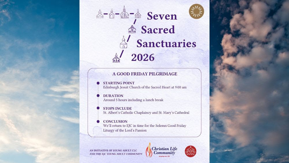 A Good Friday Pilgrimage beginning at Edinburgh Jesuit Church of the Sacred Heart, 28 Lauriston Street, Edinburgh, at 9:00am on Friday 3 April. Stops include St Albert’s Catholic Chaplaincy and St Mary’s Cathedral. For more info email acassidyshl@jesuit.org.uk