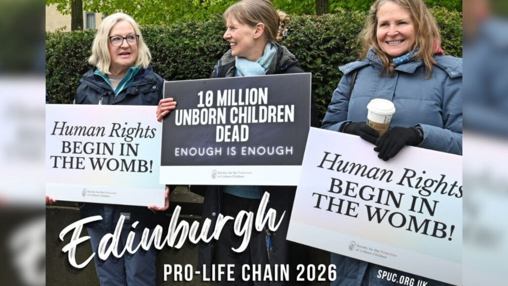 SPUC’s Pro-Life Chain takes place at 11:00am on Saturday 25 April on Lothian Road, Edinburgh, by the Sheraton Hotel. Beforehand, Archbishop Cushley leads a Rosary for Life at Sacred Heart Church, Lauriston, EH3 9DJ (optional registration here). At 1.15pm there will be refreshments in Sacred Heart Church Hall.