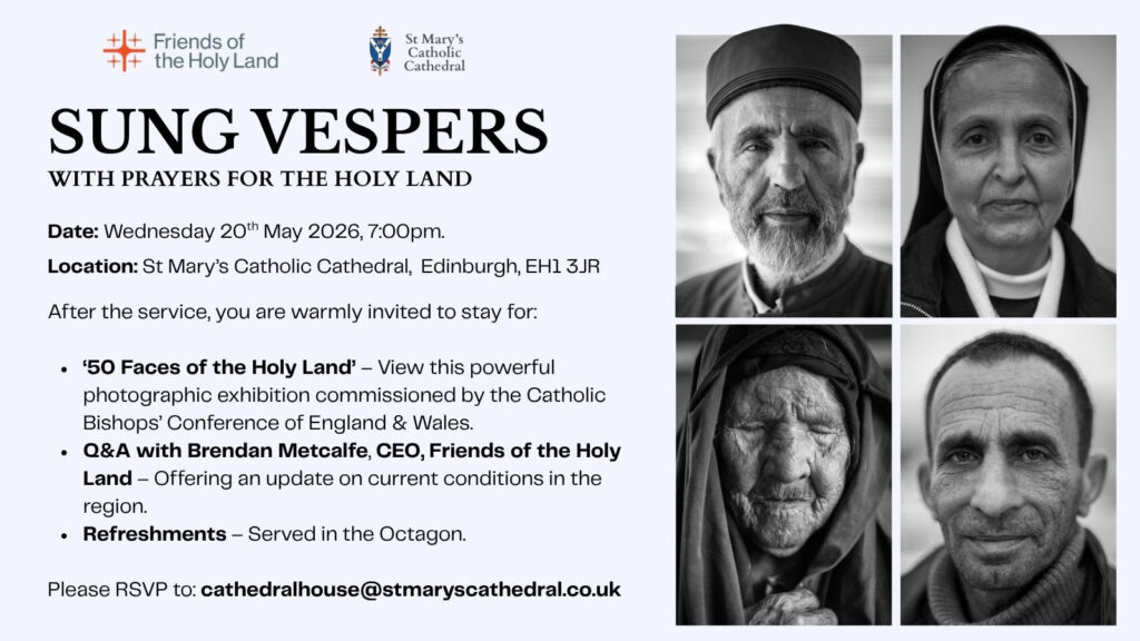 Sung Vespers with prayers for the Holy Land takes place at St Mary’s Cathedral, Edinburgh, on Wednesday 20 May at 7:00pm. Includes the exhibition 50 Faces of the Holy Land.
